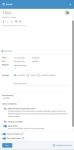 Create an Event: This is similar to a Post but it is specifically used for an event on a specific date and time. You can include items you wish people to bring and they can sign-up for them. These events will only be visible to member of your Group. They are different from the registration events that are shared church-wide.